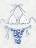 Blue floral print sexy strappy bikini set