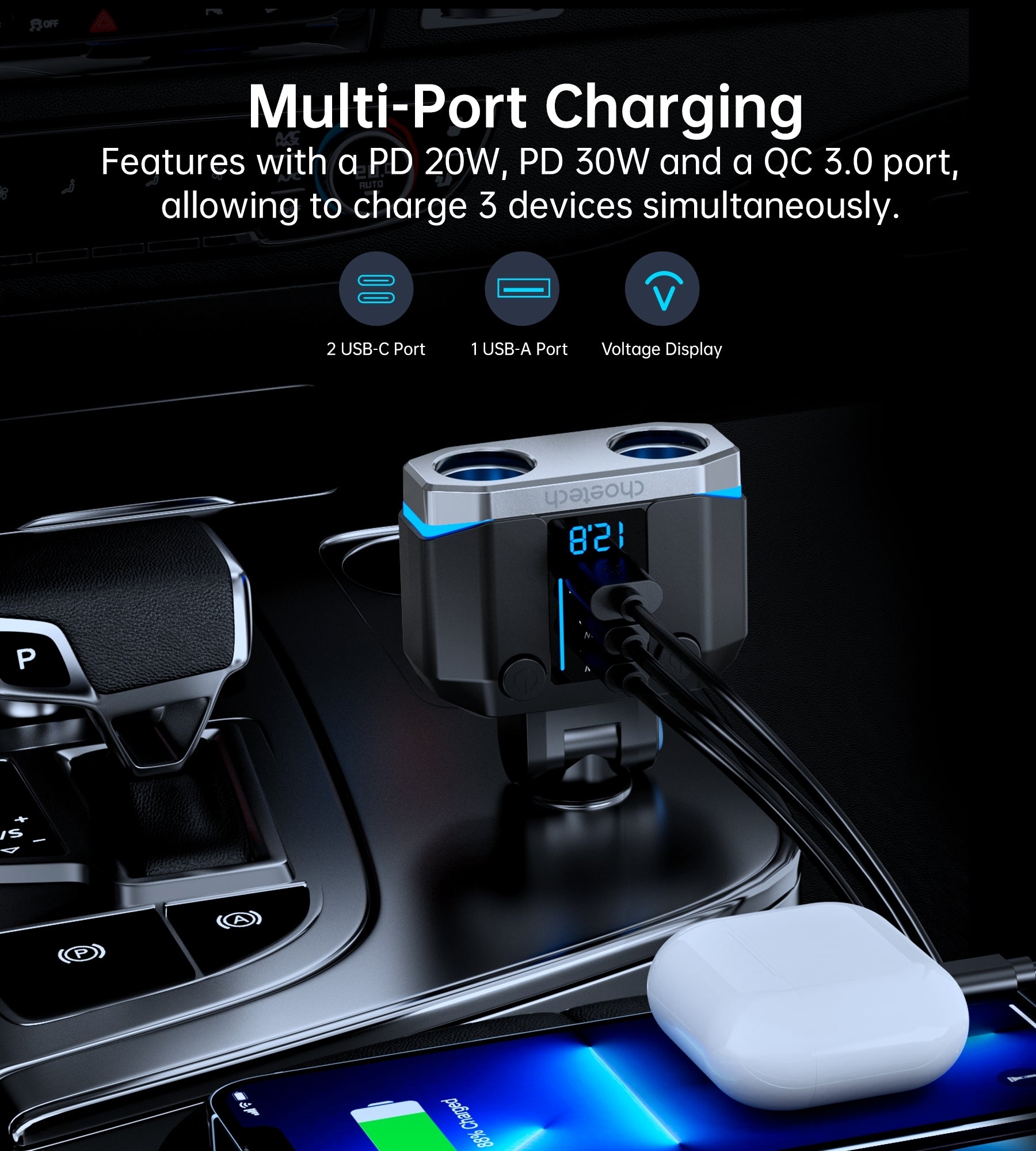 CHOETECH TC0020 45W 2 Sockets + 2x USB-C + 1x USB-A Cigarette Lighter Splitter