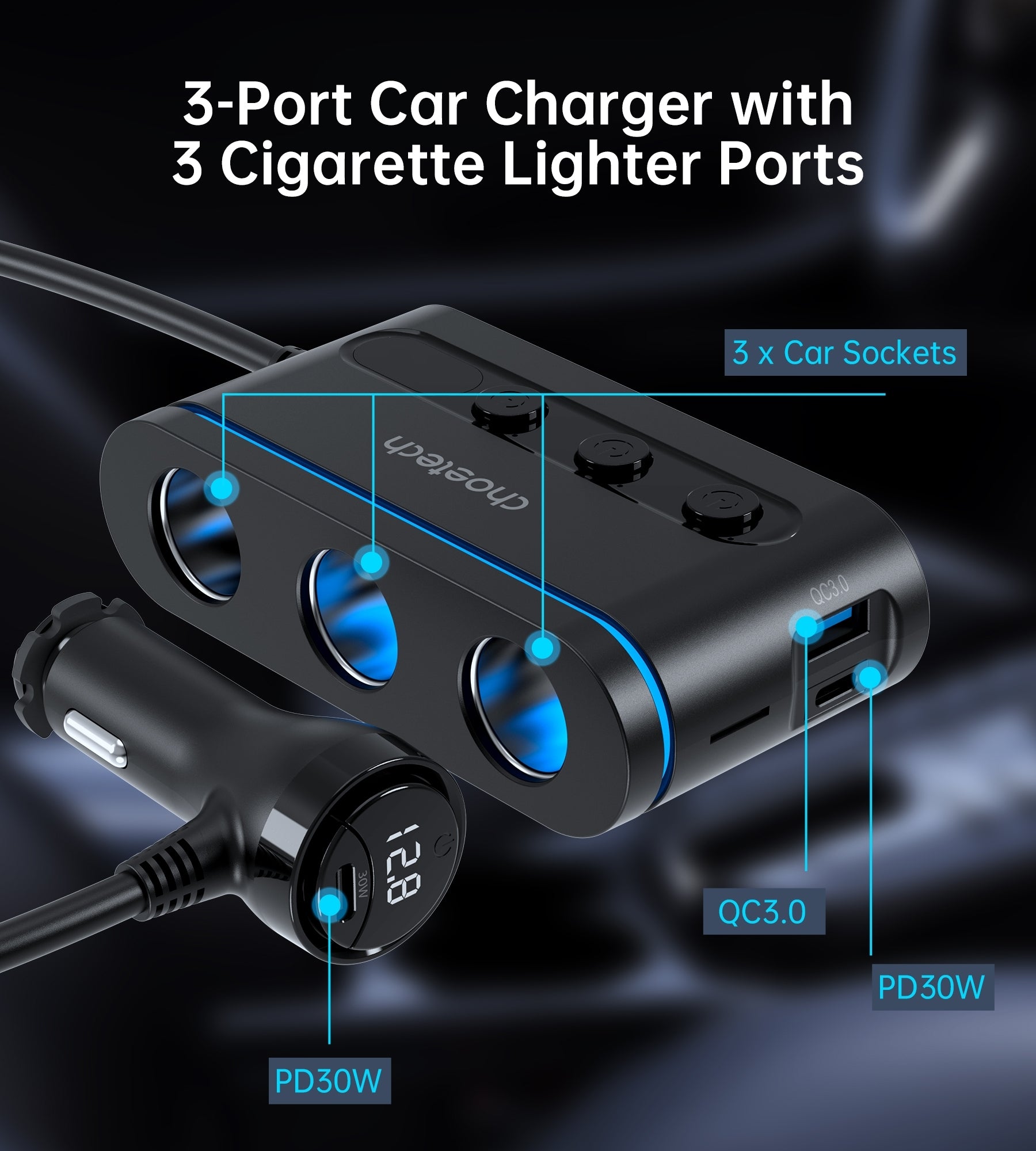 CHOETECH TC0021 3 Sockets 2C+1A Cigarette Lighter Splitter Black