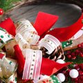 - 22-inch wreath with pine cones, red berries, and ribbon bow.