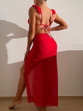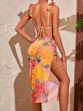 Feminine ruffled floral print cover-up three-piece bikini