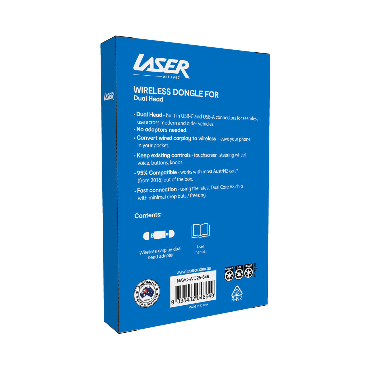 Freedom on every drive. For Australians who want the ease of wireless CarPlay without replacing their cars head unit, the new Laser Wireless CarPlay Dongle Dual Head is the smarter way forward. Whether youre commuting to work, taking the family up the coast, or heading out on a weekend road trip, it clears away the clutter of cables while keeping maps, music, calls and messages exactly where you need them on your existing CarPlay screen. Compact. Fast. Reliable. Its the upgrade your car has been waiting for.