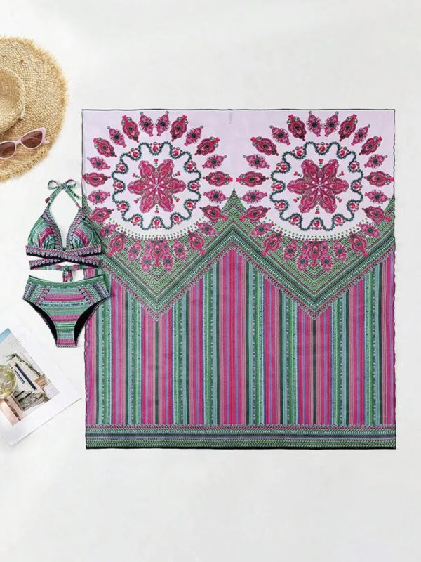 New Bikini Digital Printed Swimsuit Shawl Beach High Waist Swimsuit Three Piece Set
