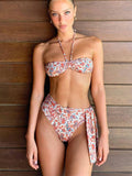 New high waist solid color strap bikini sexy backless printed split swimsuit