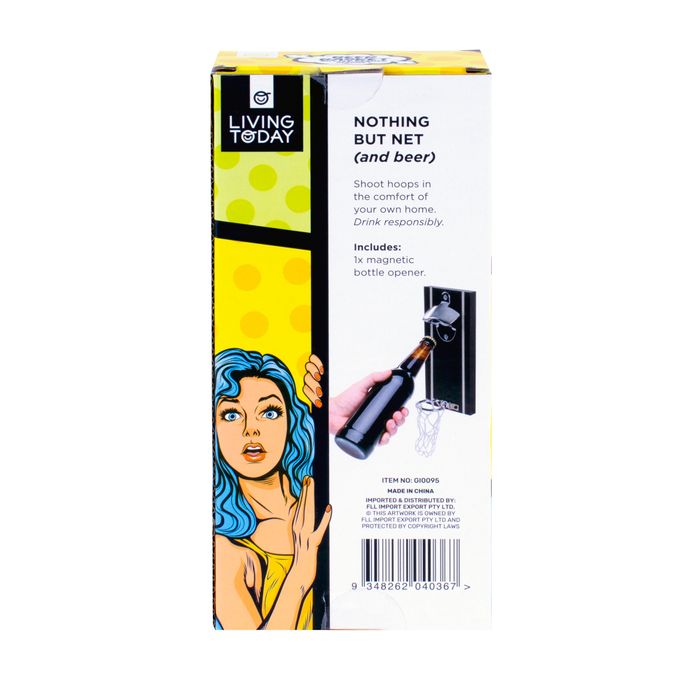 Shoot hoops in the comfort of your own home! Magnetic bottle opener has a "net" to slam dunk your bottle tops through.