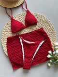 Red textured fabric bikini three piece set