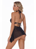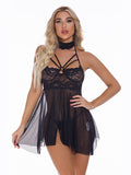 Sexy Lingerie-Sexy Temptation Lace Mesh Perspective Slit Backless Sling Nightdress With Collar