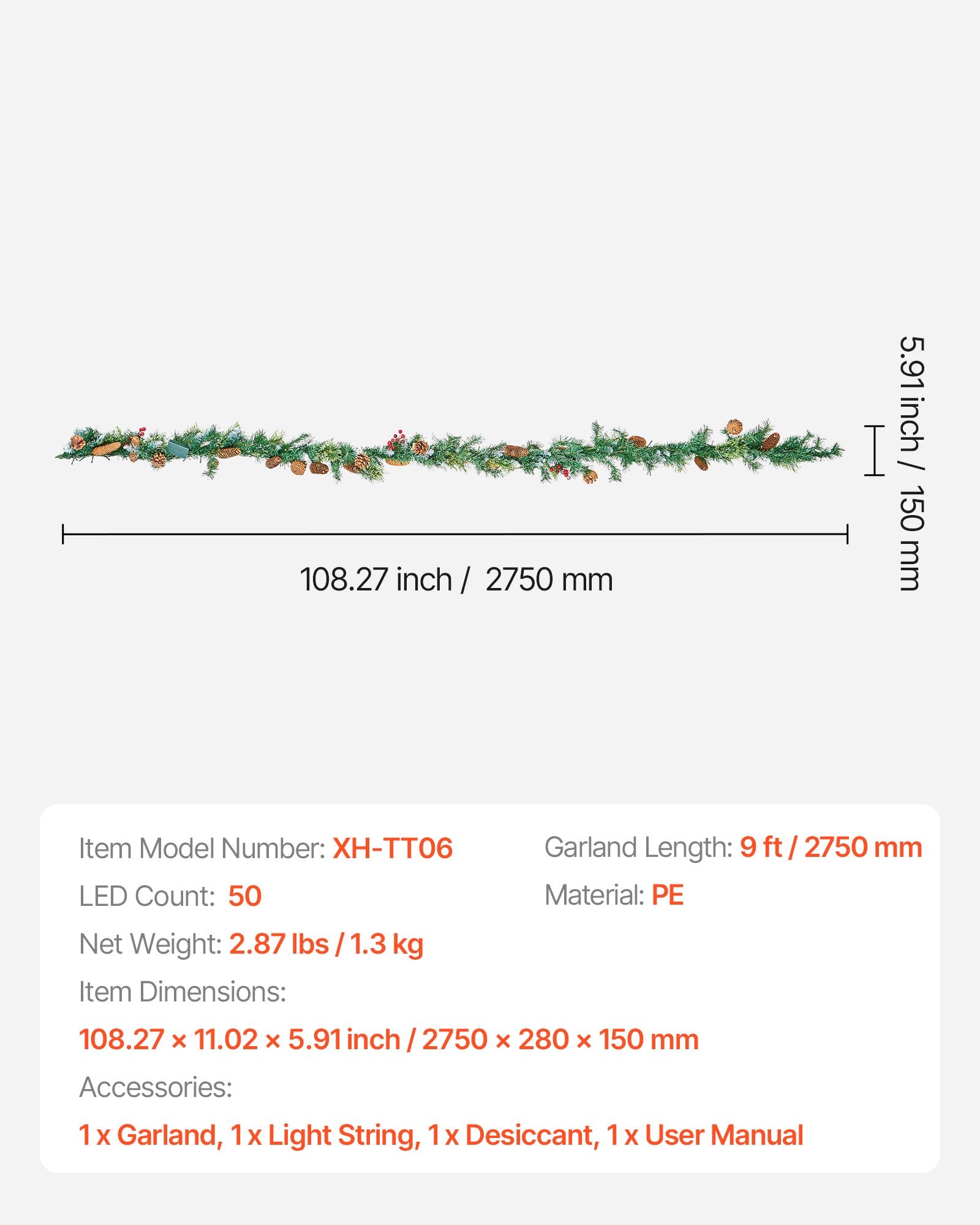 VEVOR Christmas Garland, 2750mm Artificial Christmas Garland with Light String, Faux Greenery Decoration with Berry Clusters, Pine Needles, Pine Cones, Realistic Xmas Collection for Mantel Fireplace