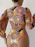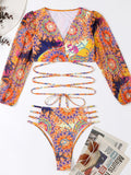 Women's Ethnic Printed Mesh Long Sleeve Bikini Set