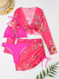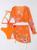 Women's Printed Drawstring Long-Sleeve Blouse Bikini Four-Piece Set