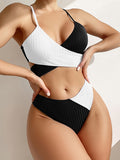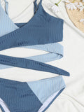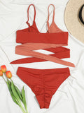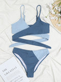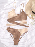Women's solid color color block thick pit strip cross strap high waist bikini